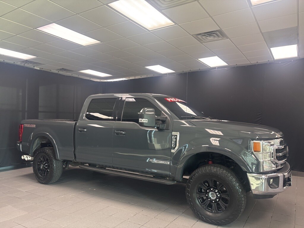 Gray Lariat 4WD 10-Speed Automatic Power Stroke 6.7L V8 DI 32V OHV Turbodiesel 4WD, 10 Speakers, 110V/400W Outlet, 397 Amp Alternator, 4-Wheel Disc Brakes, ABS brakes, All-Weather Floor Mats, Alloy wheels, AM/FM radio: SiriusXM, Automatic temperature control, Brake assist, Bumpers: chrome, Compass, Delay-off headlights, Driver vanity mirror, Electronic Stability Control, Emergency communication system: SYNC 3 911 Assist, Exterior Parking Camera Rear, Front anti-roll bar, Front Bucket Seats, Front Center Armrest, Front fog lights, Front reading lights, Fully automatic headlights, GVWR: 11,300 lb Payload Package, Heated door mirrors, Leather steering wheel, Order Code 618A, Overhead console, Panic alarm, Passenger door bin, Power door mirrors, Power driver seat, Power passenger seat, Power steering, Power windows, Rapid-Heat Supplemental Cab Heater, Rear Parking Sensors, Rear step bumper, Rear window defroster, Remote keyless entry, Remote Start System, Security system, Speed control, Split folding rear seat, SYNC 3 Communications & Entertainment System, Tilt steering wheel, Turn signal indicator mirrors, Ultimate Trailer Tow Camera System, Variably intermittent wipers.