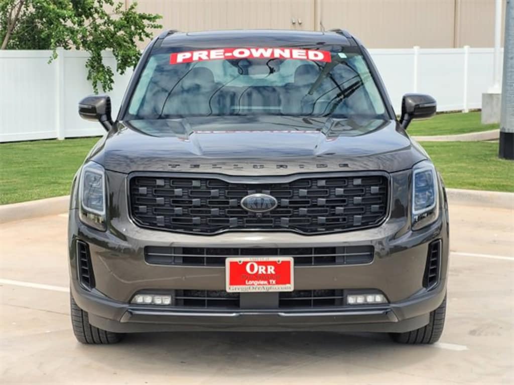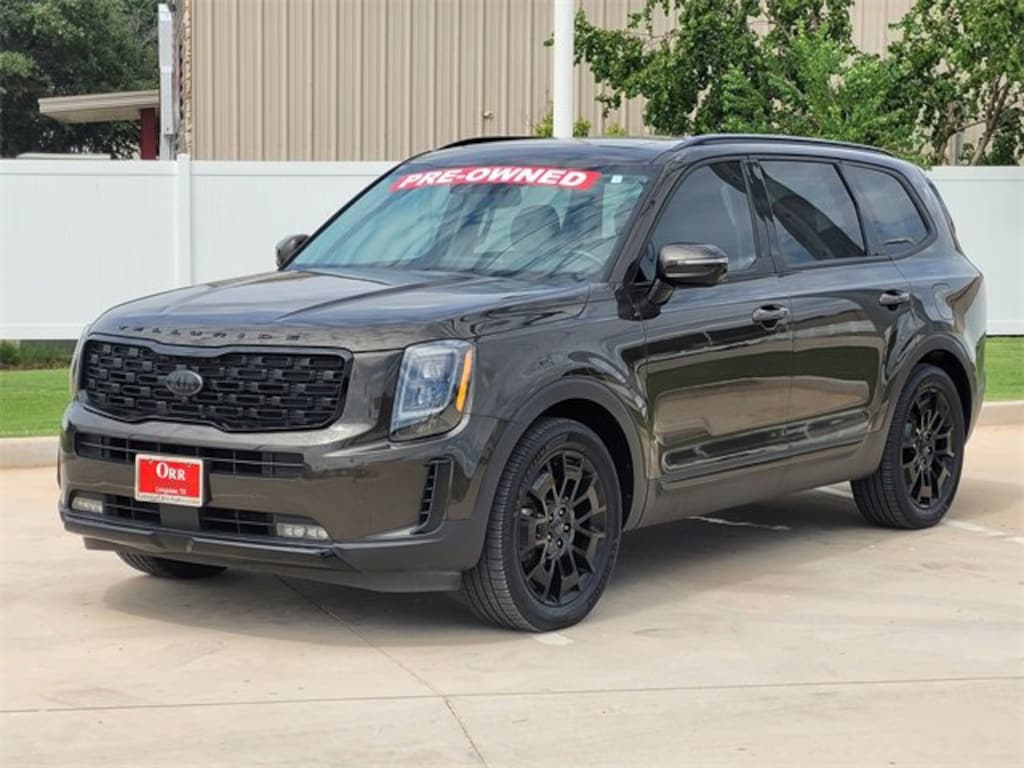 This 2021 Kia Telluride comes equipped with Nightfall Edition Package (Black Finish Radiator Grille, Body Color Exterior Door Handles, Exclusive Black Fog Light Bezel, Exclusive Black Headlight Bezels, Front & Rear Gloss Black Finish Bumper Skid Plates, Front & Rear KIA Logo, Gloss Black Finish Exterior Emblems, Gloss Black Finish Front & Rear Door Garnish, Gloss Black Finish Roof Rails, and Wheels: 7.5 x 20 Exclusive Black Finish Alloy), Towing Package (Self Leveling Rear Suspension and Tow Hitch w/Harness (TOF)), Navigation System, 10 Speakers, 3.648 Axle Ratio, 3rd row seats: split-bench, 4-Wheel Disc Brakes, ABS brakes, Air Conditioning, Alloy wheels, AM/FM radio: SiriusXM, Apple CarPlay & Android Auto, Auto High-beam Headlights, Auto-dimming Rear-View mirror, Automatic temperature control, Brake assist, Bumpers: body-color, Carpeted Floor Mats, Compass, Delay-off headlights, Driver door bin, Driver vanity mirror, Dual front impact airbags, Dual front side impact airbags, Electronic Stability Control, Emergency communication system: 911 Connect, Four wheel independent suspension, Front anti-roll bar, Front Bucket Seats, Front Center Armrest, Front dual zone A/C, Front fog lights, Front reading lights, Fully automatic headlights, Garage door transmitter: HomeLink, Heated & Ventilated Front Bucket Seats, Heated door mirrors, Heated front seats, Heated steering wheel, Illuminated entry, Knee airbag, Leather Seat Trim, Leather Shift Knob, Leather steering wheel, Low tire pressure warning, Memory seat, Occupant sensing airbag, Outside temperature display, Overhead airbag, Overhead console, Panic alarm, Passenger door bin, Passenger vanity mirror, Power door mirrors, Power driver seat, Power Liftgate, Power moonroof, Power passenger seat, Power steering, Power windows, Radio data system, Radio: AM/FM/SIRIUS Premium Audio, Rear air conditioning, Rear anti-roll bar, Rear audio controls, Rear reading lights, Rear window defroster, Rear window wiper, Reclining 3rd row seat, Remote keyless entry, Roof rack: rails only, Security system, Smart Key w/ Push Button and Remote Start, Speed control, Speed-sensing steering, Split folding rear seat, Spoiler, Steering wheel mounted audio controls, Tachometer, Telescoping steering wheel, Tilt steering wheel, Traction control, Trip computer, Turn signal indicator mirrors, Variably intermittent wipers, Ventilated front seats, and Wheels: 7.5 x 20 Black Finish Alloy. CARFAX One-Owner. Clean CARFAX. One Owner Carfax, Black Finish Radiator Grille, Body Color Exterior Door Handles, Exclusive Black Fog Light Bezel, Exclusive Black Headlight Bezels, Front & Rear Gloss Black Finish Bumper Skid Plates, Front & Rear KIA Logo, Gloss Black Finish Exterior Emblems, Gloss Black Finish Front & Rear Door Garnish, Gloss Black Finish Roof Rails, Navigation System, Nightfall Edition Package, Self Leveling Rear Suspension, Tow Hitch w/Harness (TOF), Towing Package, Wheels: 7.5 x 20 Exclusive Black Finish Alloy.