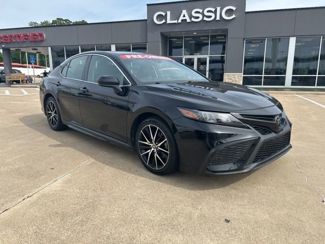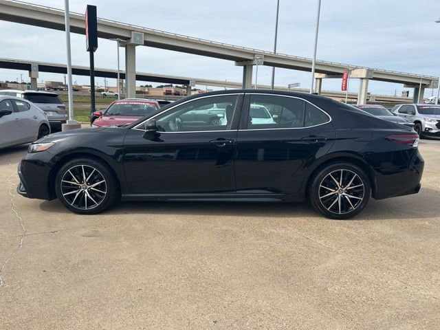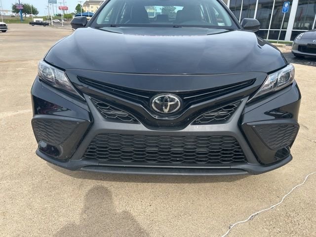 This 2021 Toyota Camry comes equipped with Black Cloth, 4-Wheel Disc Brakes, 6 Speakers, ABS brakes, Air Conditioning, Alloy wheels, AM/FM radio: SiriusXM, Apple CarPlay/Android Auto, Auto High-beam Headlights, Automatic temperature control, Brake assist, Bumpers: body-color, Delay-off headlights, Driver door bin, Driver vanity mirror, Dual front impact airbags, Dual front side impact airbags, Electronic Stability Control, Emergency communication system: Safety Connect with 1-year trial, Exterior Parking Camera Rear, Fabric Seat Trim w/Sport SofTex, Four wheel independent suspension, Front anti-roll bar, Front Bucket Seats, Front Center Armrest, Front reading lights, Fully automatic headlights, Illuminated entry, Knee airbag, Low tire pressure warning, Occupant sensing airbag, Outside temperature display, Overhead airbag, Overhead console, Panic alarm, Passenger door bin, Passenger vanity mirror, Power door mirrors, Power driver seat, Power steering, Power windows, Radio data system, Radio: AM/FM Audio System, Rear anti-roll bar, Rear seat center armrest, Rear side impact airbag, Rear window defroster, Remote keyless entry, Security system, Speed control, Speed-sensing steering, Split folding rear seat, Spoiler, Steering wheel mounted audio controls, Tachometer, Telescoping steering wheel, Tilt steering wheel, Traction control, Trip computer, Variably intermittent wipers, and Wheels: 8.0J x 18 Black Machined-Finish Alloy. Clean CARFAX. 28/39 City/Highway MPG Black Cloth.